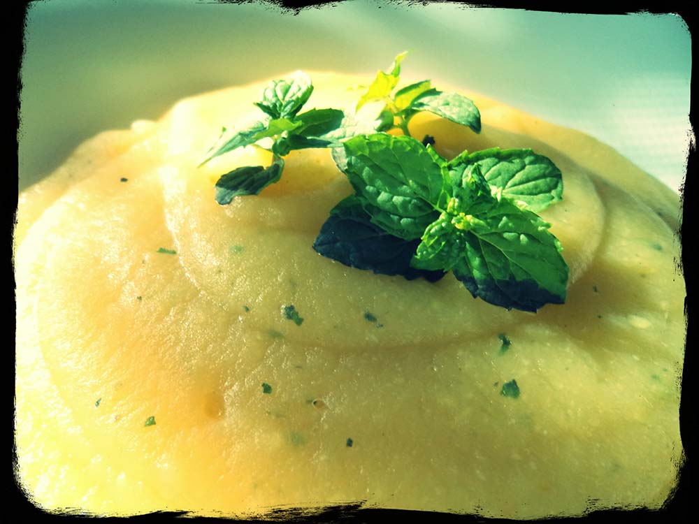 Once the heat is off, add grated ginger and chopped mint leaves. Puree with an immersion blender until smooth.