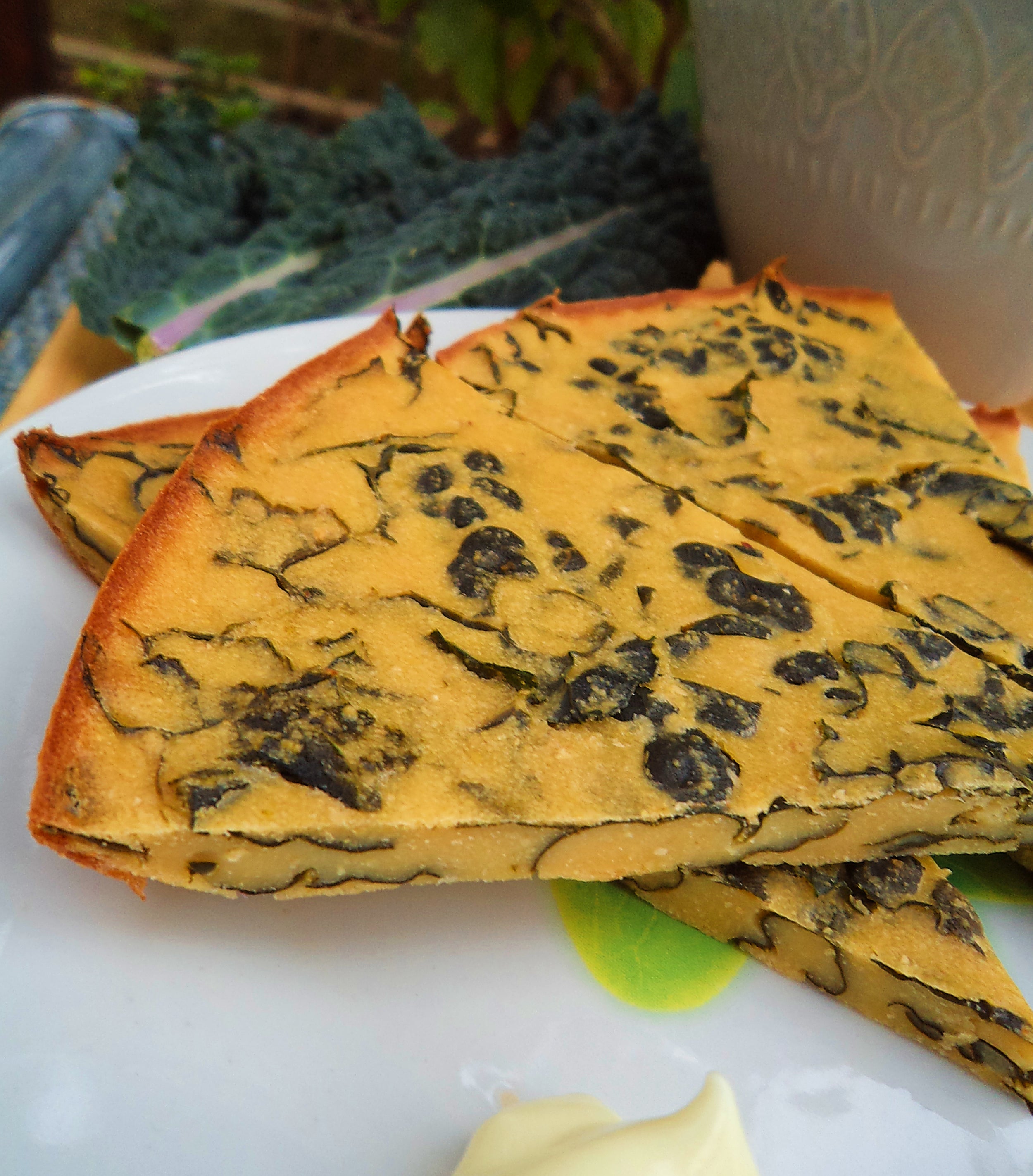 This frittata is packed with health! The black cabbage (lacinato kale) is rich in chlorophyll and is a good source of calcium and antioxidants. If you clean it and slice it at least 40 minutes before cooking, you'll also get a supply of the precious sulforaphane. Chickpea flour has a good protein content; nutritional yeast is a source of B vitamins. Last but not least, this is a really low-fat recipe.