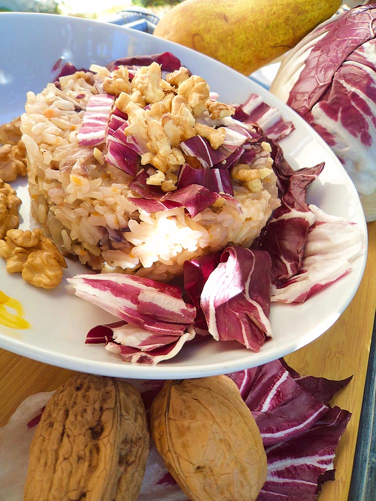 This is a nutritionally complete and sensorially nuanced first course. The delicate sweetness of the pears softens the bitterness of the radicchio, while the Prosecco (a white dry sparkling wine) provides an aromatic background note. The strong taste of walnuts completes the harmonic mix of flavors.