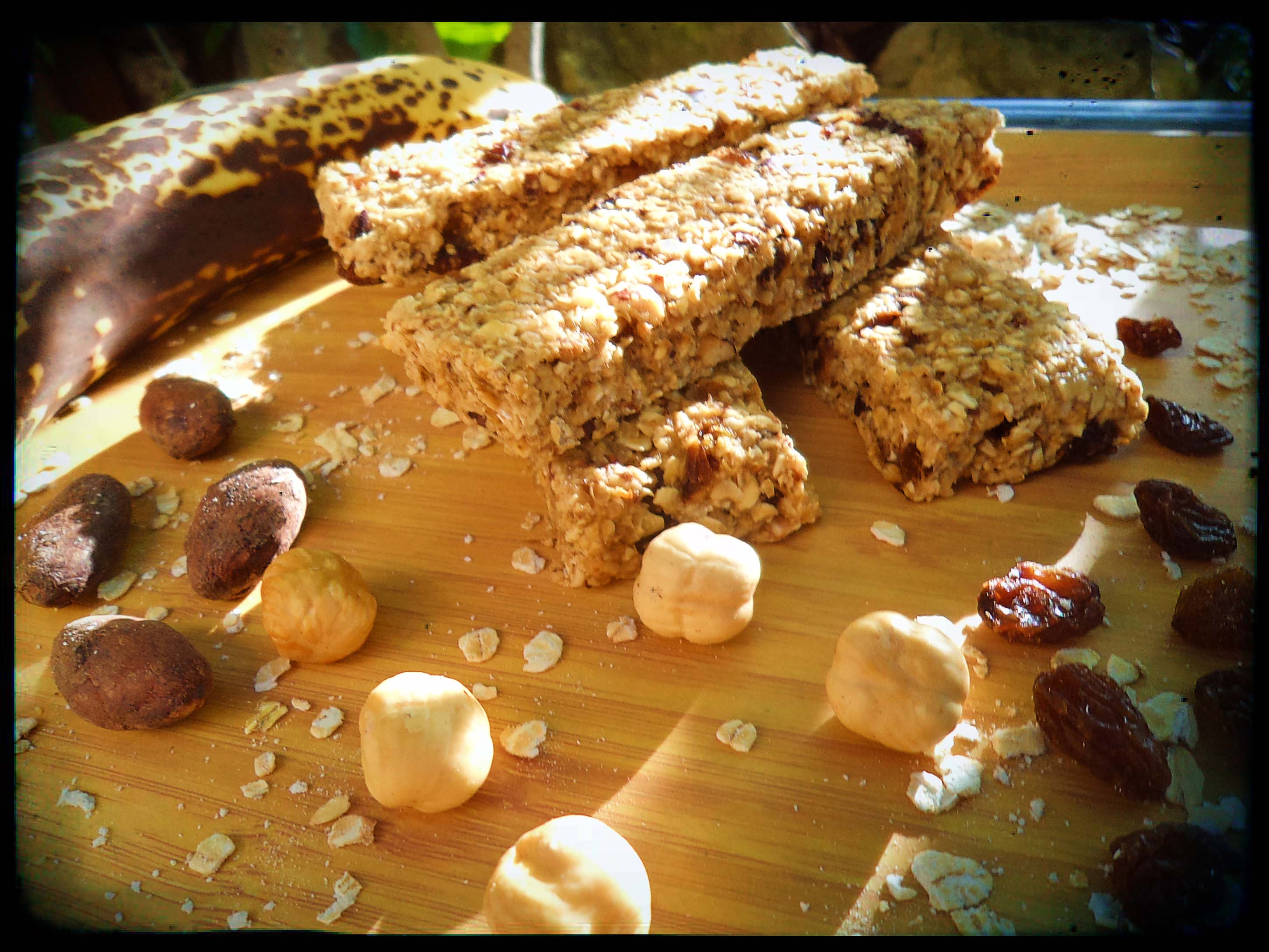 Put the minced oatmeal and hazelnuts in a bowl, add the chopped raisins and cocoa nibs. Peel the two bananas and mash the pulp inside a plate with a fork; add it to the bowl with the other ingredients and mix well until a thick dough forms.