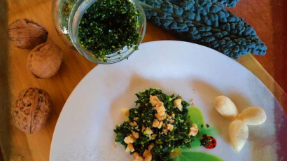 Black cabbage, dinosaur kale, lacinato kale, tuscan kale are different names to identify the same plant with countless beneficial properties. This fragrant pesto can be served in a variety of ways, including dressing pasta, rice, or other grains, spreading it on slices of toasted bread or adding it to a salad, wrapping it in Belgian endive leaves or radicchio, and many more.