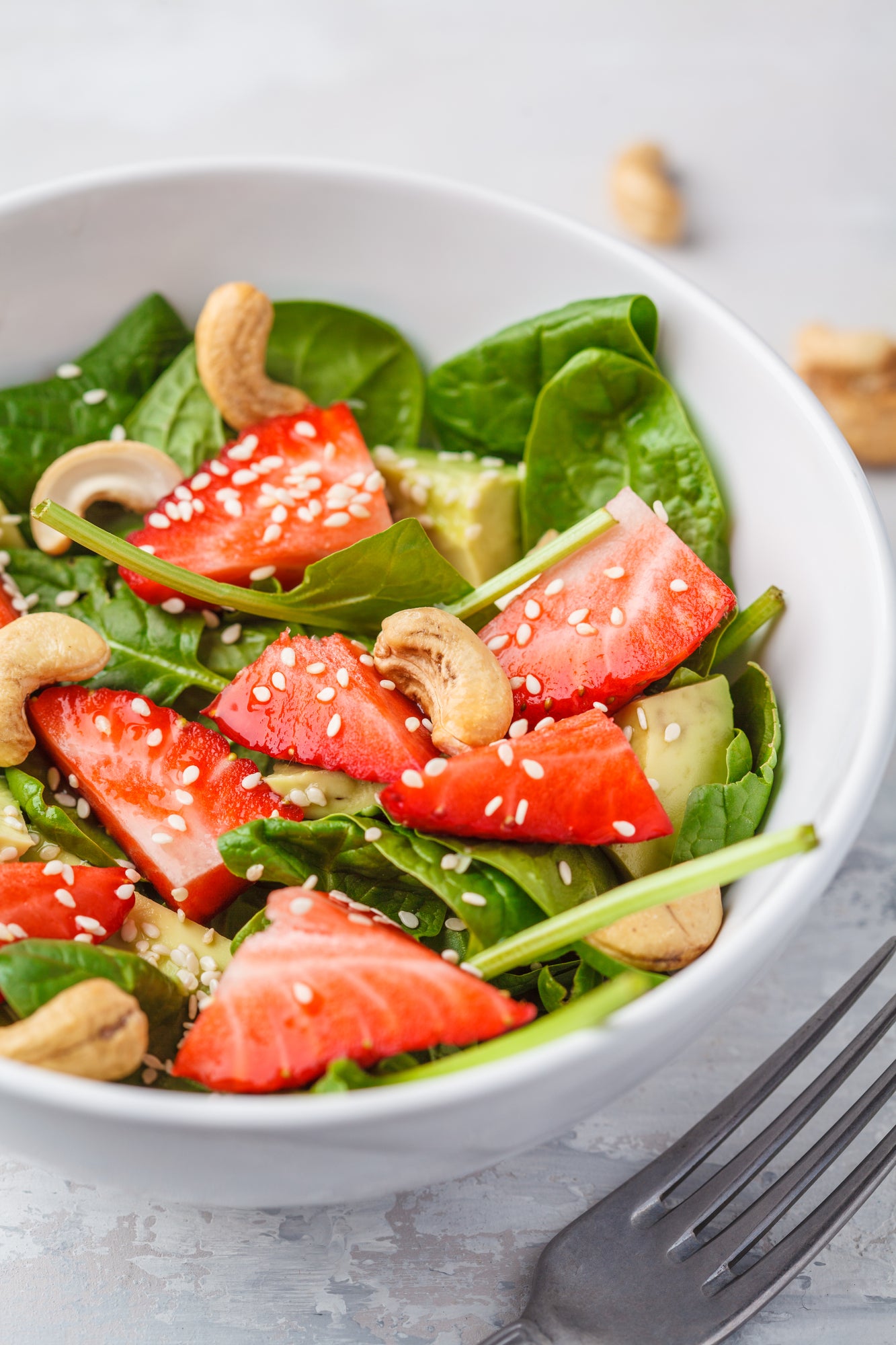 In a large mixing bowl add spinach, strawberries, avocado, and cashews. Toss in dressing and mix until evenly coated.