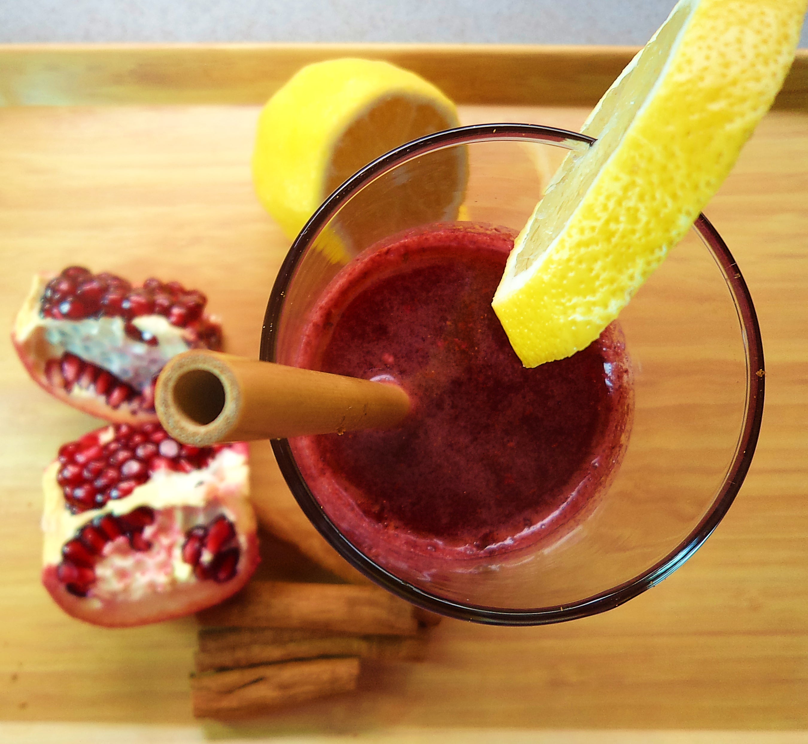 Pro tip: Extracting pomegranate juice with a slow juicer preserves more of the fruit's valuable nutrients. By using a bamboo straw we can avoid producing plastic waste.